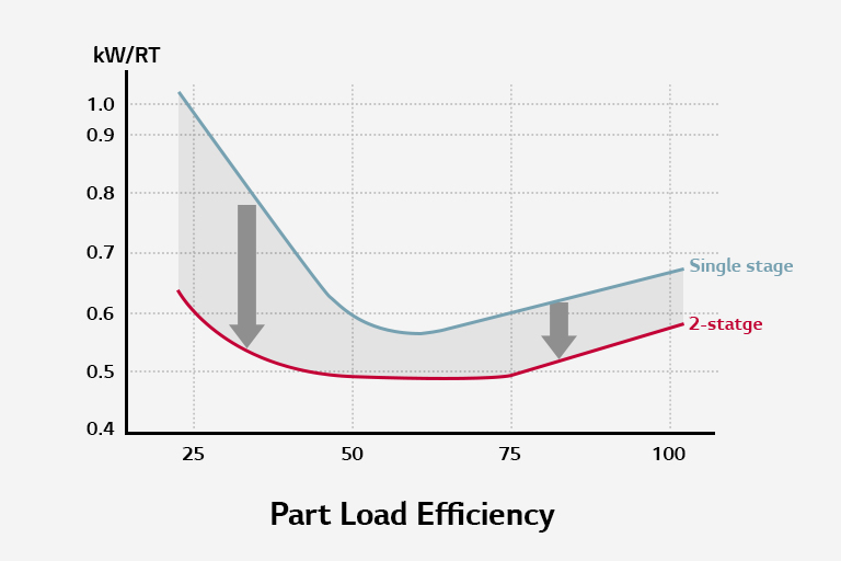 Centrifugal Chiller achieved high efficiency through Two-stage Compressor. With optimized Two-stage compressing cycle, energy efficiency has been improved and operation costs has been reduced as opposed to the previous One-stage Centrifugal Chiller.