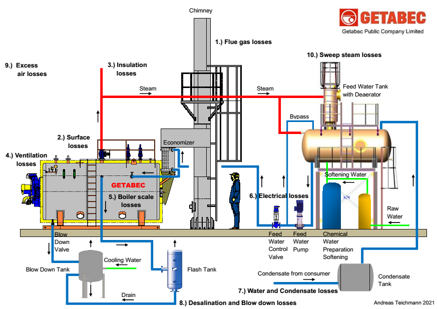 The steam system contains hundreds of sensors that collect a variety of different readings from all components of the system such as the feed water tank, condensate tank, pumps, boilers, burners and the exhaust system. Examples of measured data points are the amount of steam consumed, temperatures, pressures, burner loads, pump speed, exhaust gas temperatures and much more.